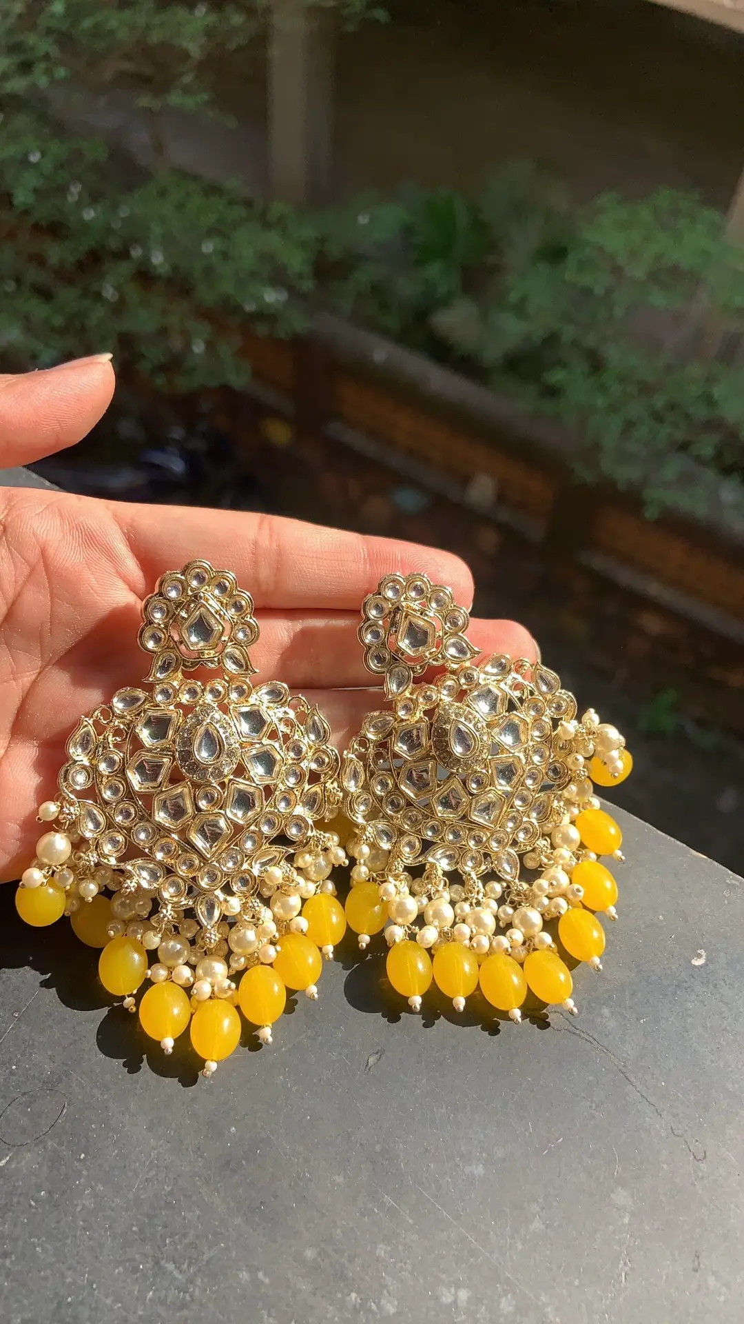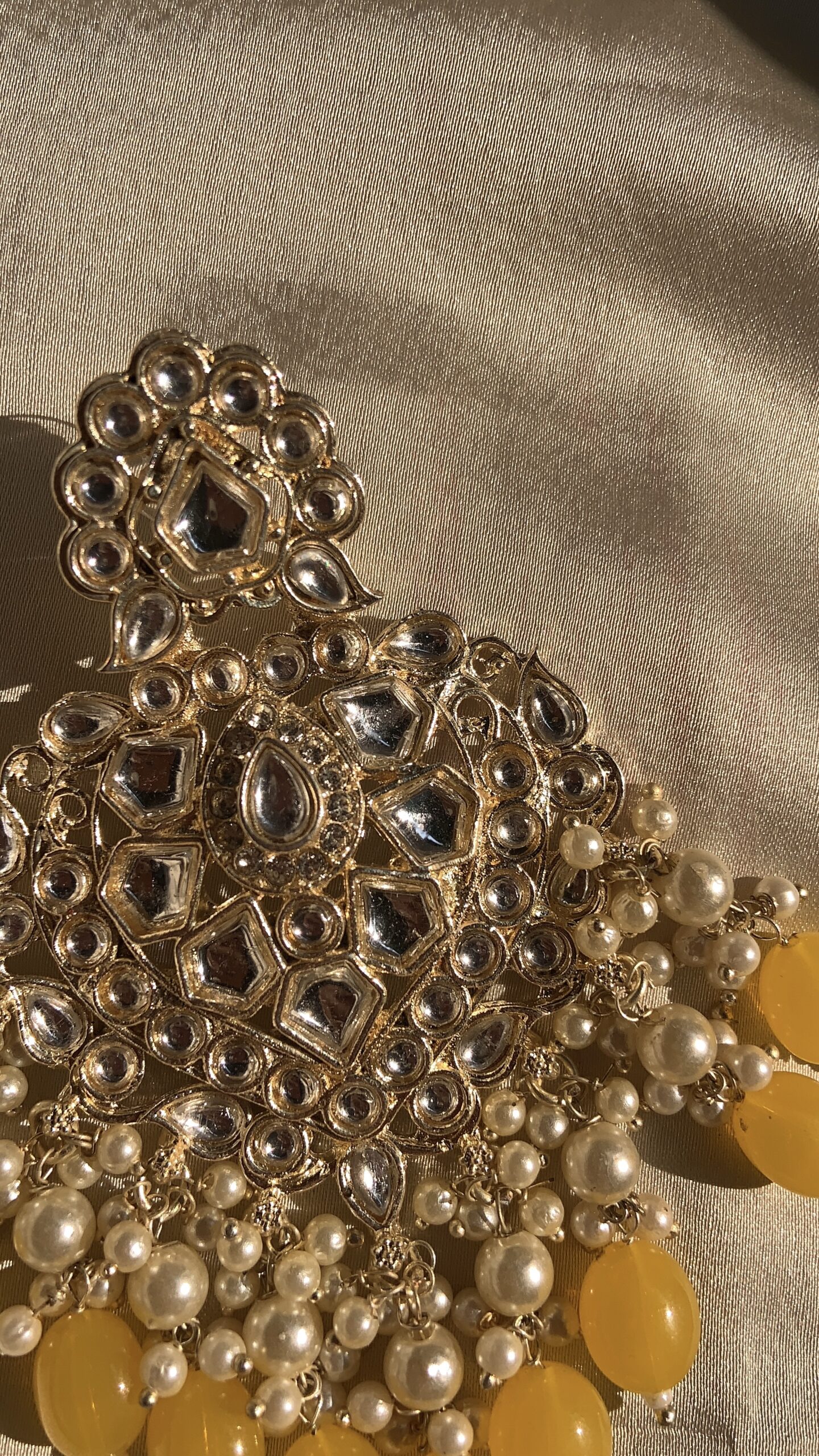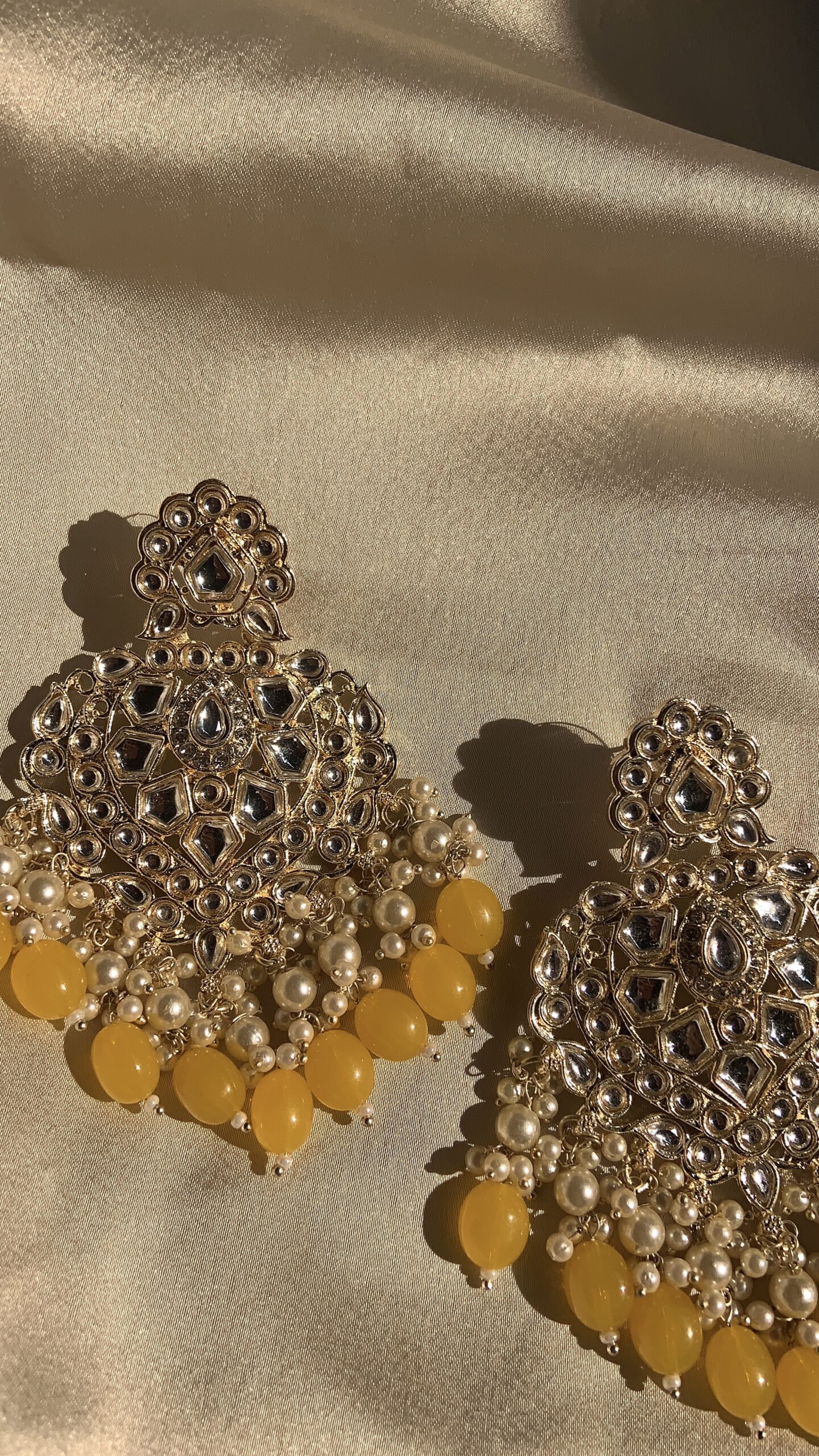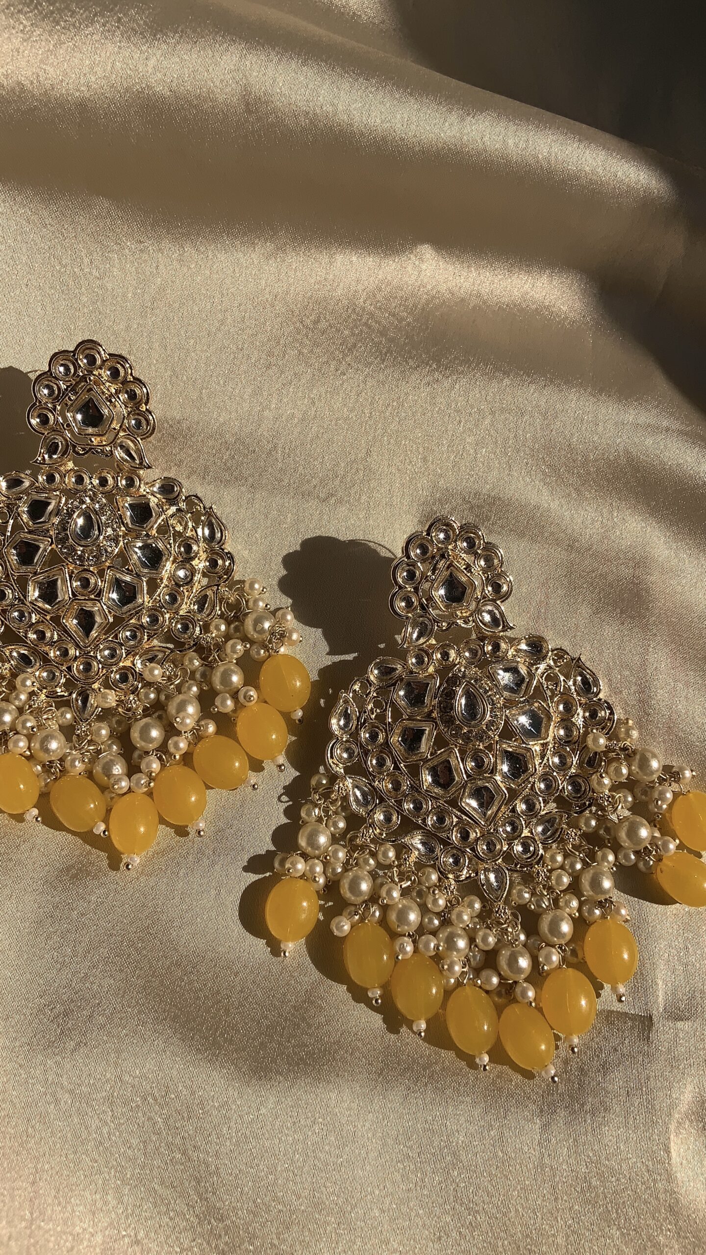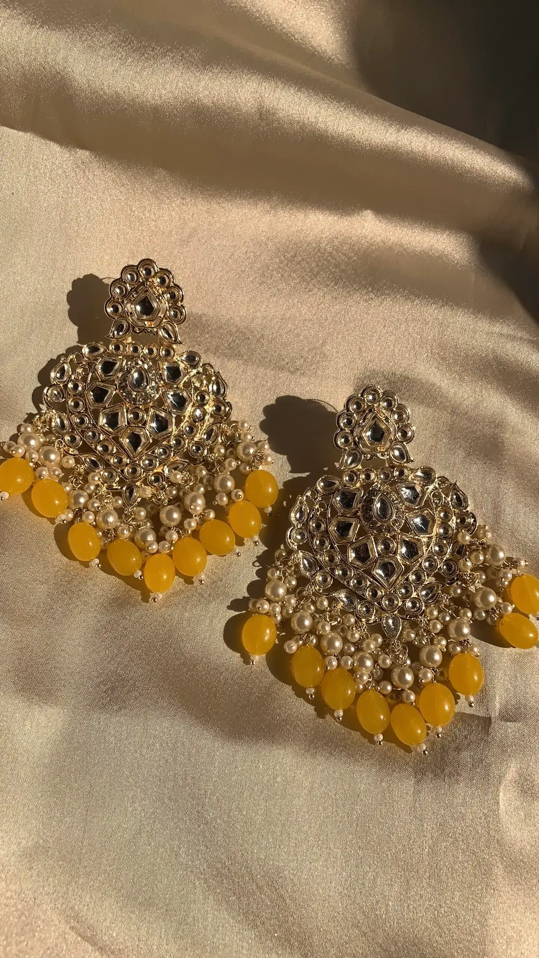 These are ornate traditional Indian chandbali-style earrings, beautifully crafted with a regal flair. The design features a grand crescent shape (chandbali) studded with multiple reflective kundan stones arranged in intricate floral and paisley patterns. The lower edge of the earrings is adorned with a fringe of clustered off-white pearls and vibrant mustard-yellow bead drops, giving them a rich, festive appeal. The top of the earring has a small floral motif that leads to the stud portion.