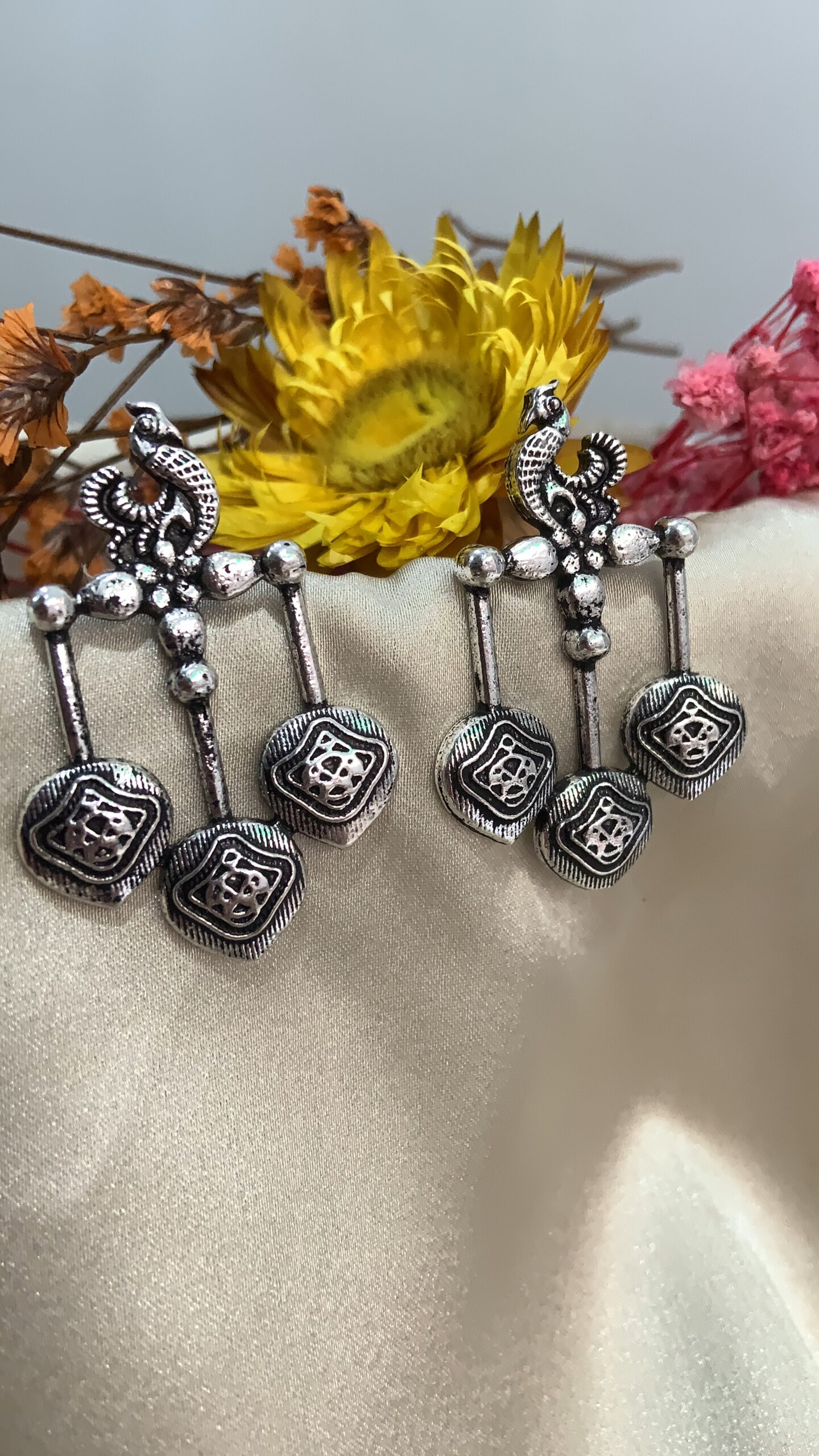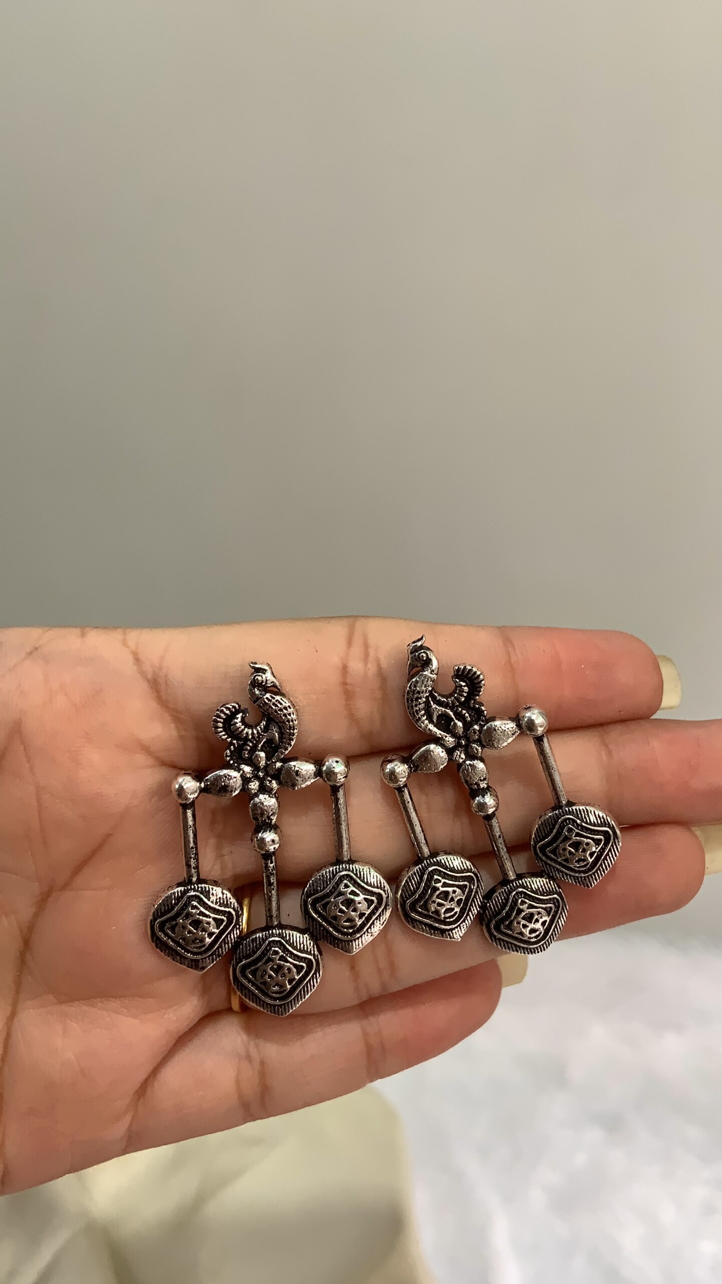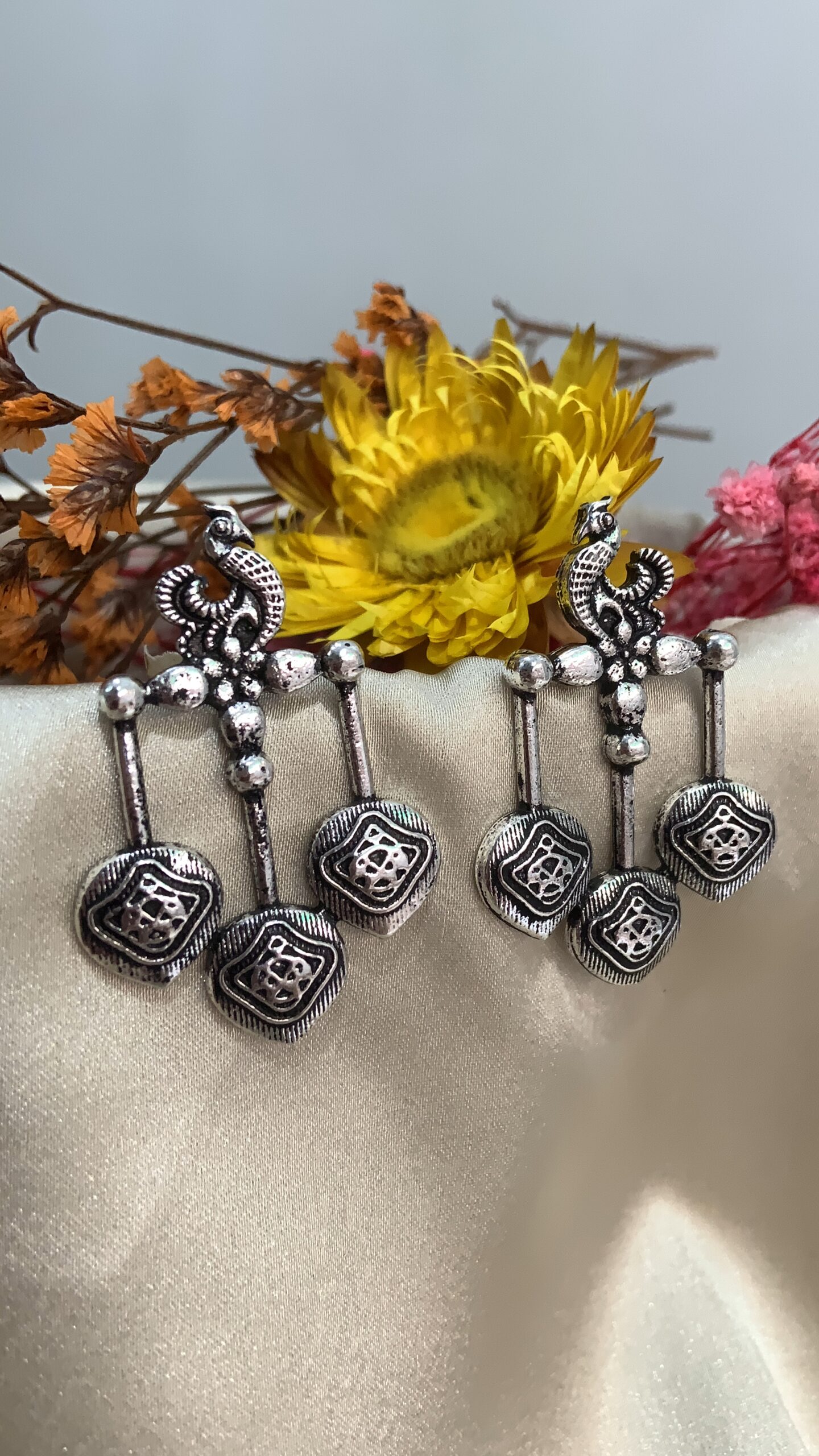 These beautifully handcrafted oxidized silver earrings feature a timeless peacock-inspired design, perfect for those who love traditional elegance. The earrings showcase intricate detailing with a classic dangle style, giving them a graceful and eye-catching look. The dual-tiered structure includes ornamental silver beads and geometric charms, adding a rustic yet charming vibe.