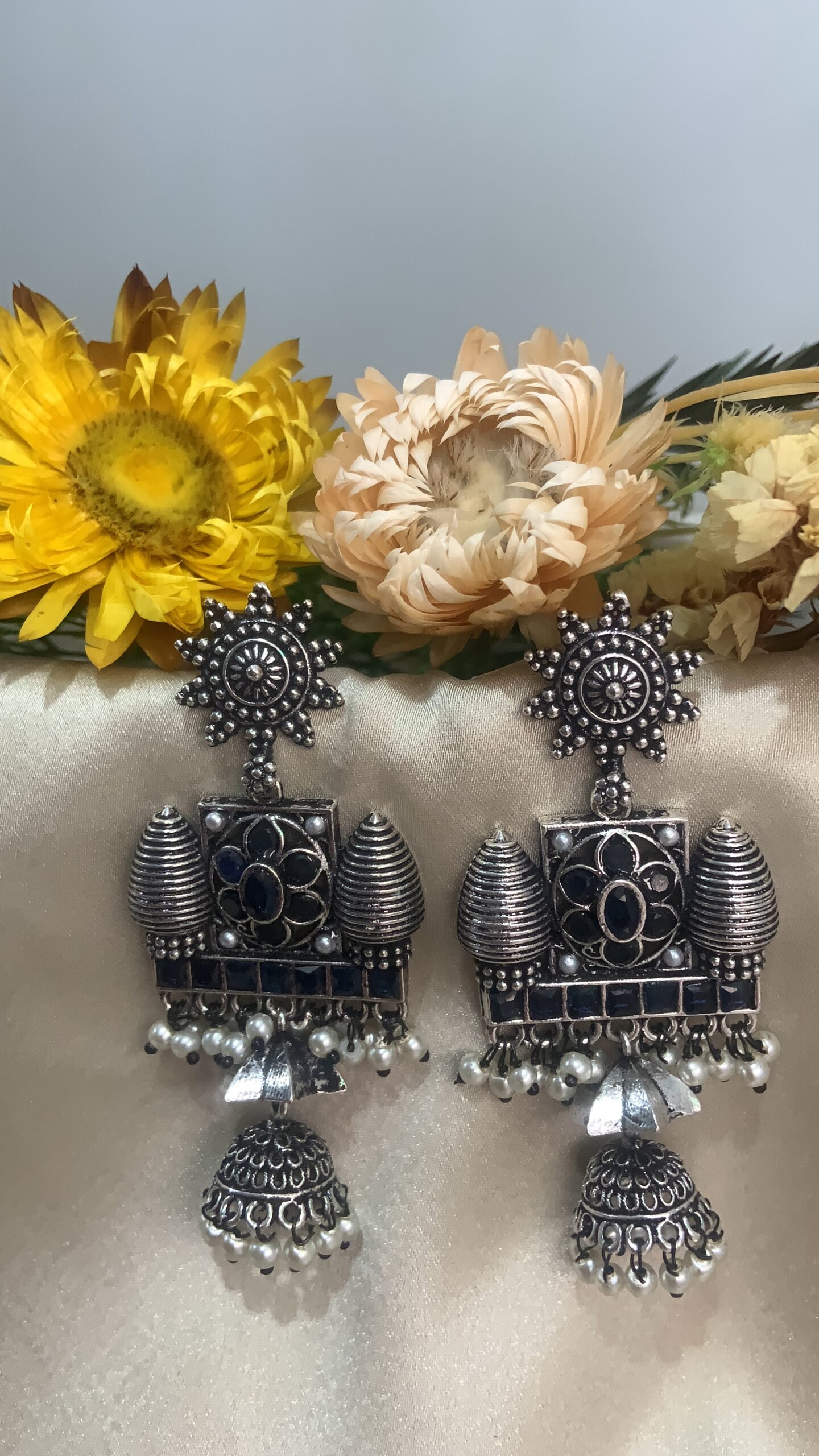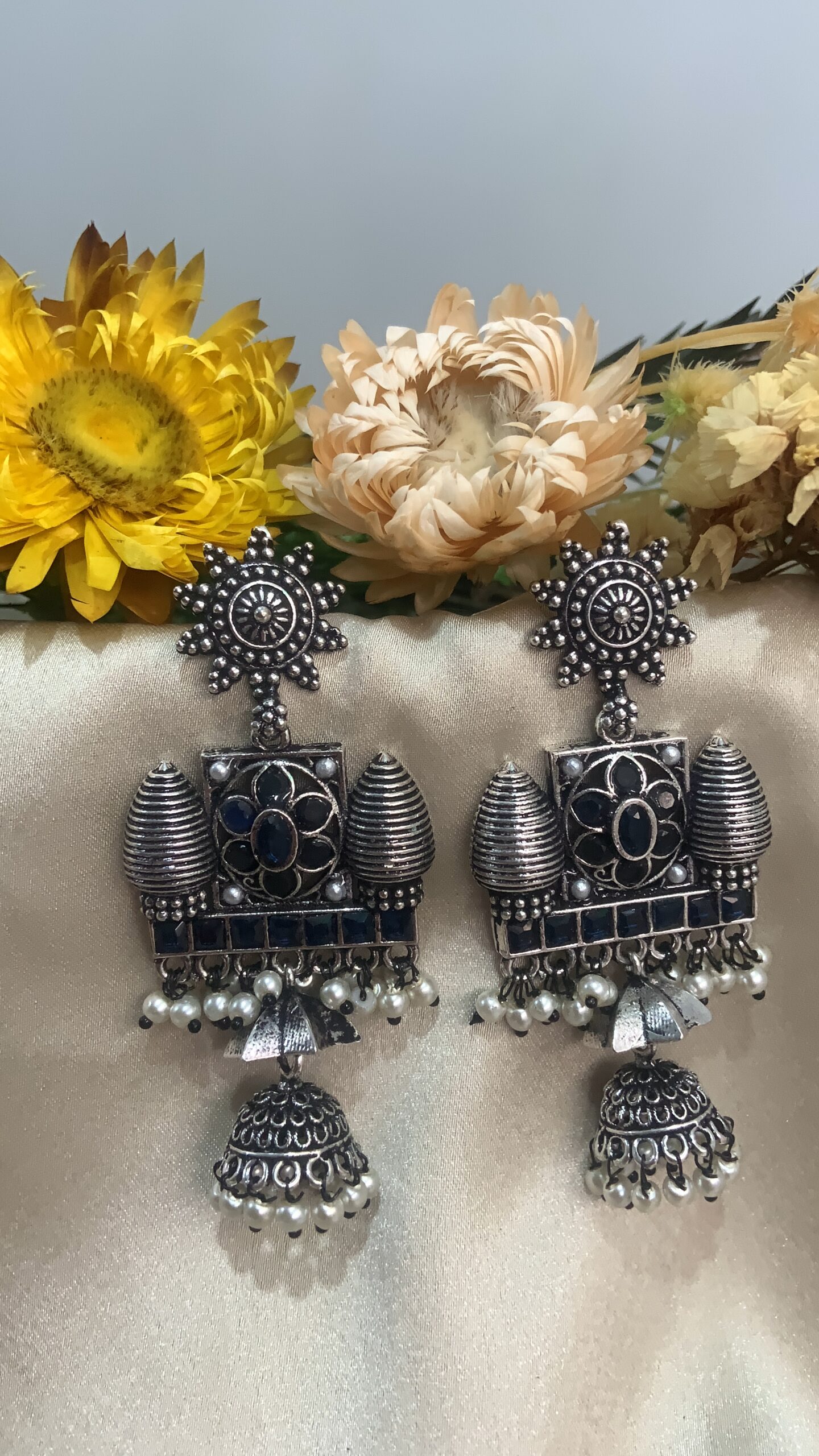 These handcrafted oxidized silver statement earrings are a perfect blend of traditional artistry and modern style. Featuring a floral sunburst stud at the top, they transition into a beautifully detailed square panel with intricate designs and dark blue faux stones. The dual-layered jhumka design below is adorned with tiny pearls, adding movement and charm to the piece. Perfect for ethnic events, these earrings radiate elegance and timeless appeal.